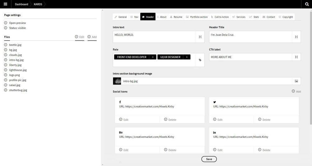 KARDS. is a full-featured personal landing page, online resume and portfolio theme for Kirby CMS. This theme was built for Kirby 2.3+. It is based on the Kards theme by Styleshout and was adapted for Kirby.
